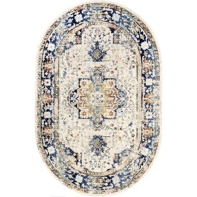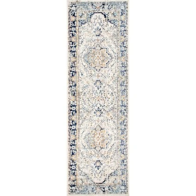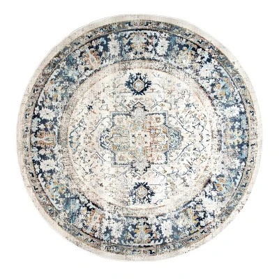 The distressed medallion pattern of this rug blends vintage style with functional comfort. This unique color combination can add charm to any space.