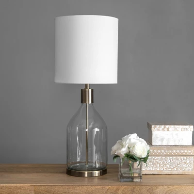 Let your room shine with the addition of this modern, 29-inch high, glass lamp. Its linen shade delivers ambient lighting to an area. Add a vibrant flair to any room with its gold finish. A rug pad is recommended to prevent slipping and to keep the rug lying flat in one place.