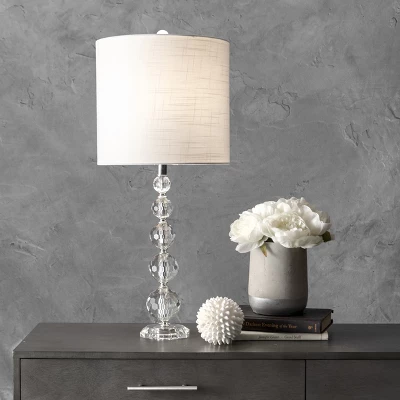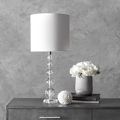 Let your room shine with the addition of this modern, 27-inch high, Crystal lamp. Its linen shade delivers ambient lighting to an area. Add a vibrant flair to any room with its Clear finish. A rug pad is recommended to prevent slipping and to keep the rug lying flat in one place.